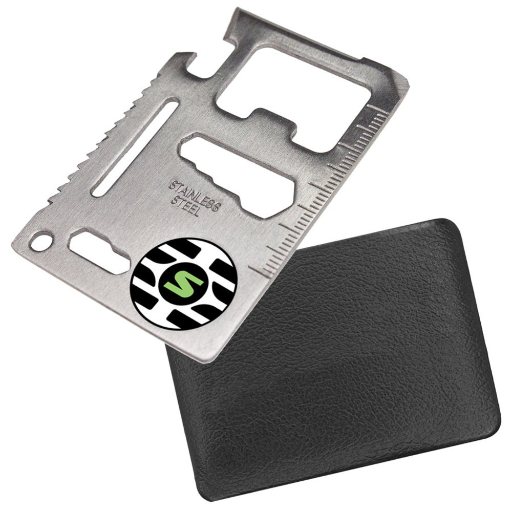 This credit card sized tool includes a Can Opener, Knife Edge, Screwdriver, Ruler, Bottle Opener, 4-Position Wrench, Butterfly Screw Wrench, Saw Blade, 2-Position Wrench & Keychain Hole. Also includes black case.